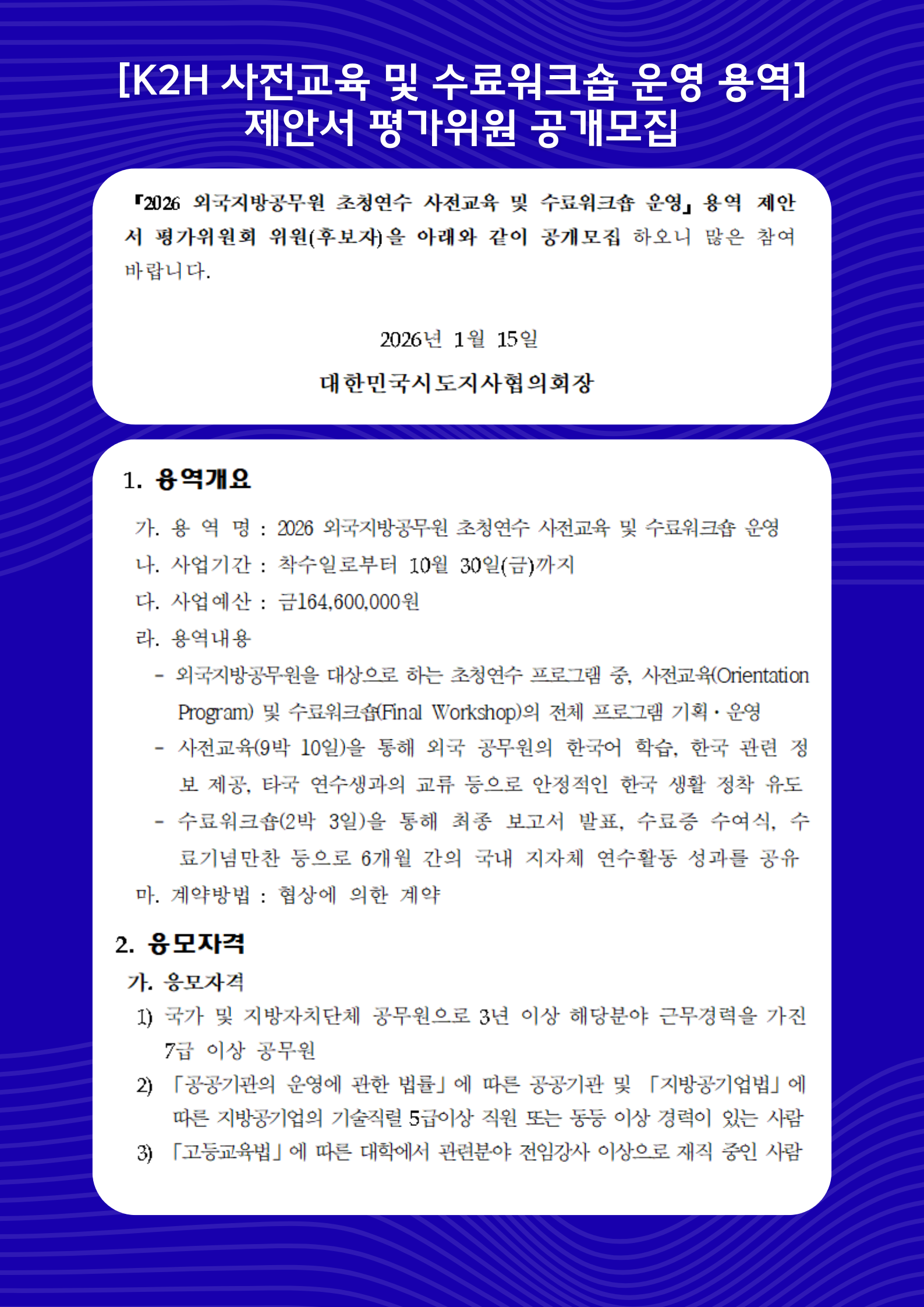 2026 외국지방공무원 초청연수(K2H Program) 사전교육 및 수료워크숍 운영 용역 제안서 평가위원회 위원 공개모집