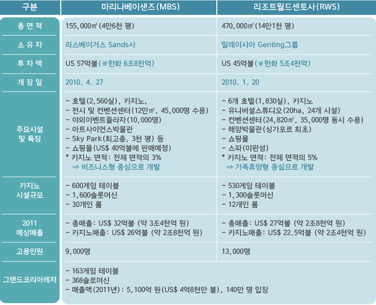 2010년 총매출액 약 S$ 18억불(약 1조6천억 원) - 영업이익이 S$ 8억3천만 불(2011년 S$ 16억불 예상) - 카지노 매출액이 약 88%를 차지