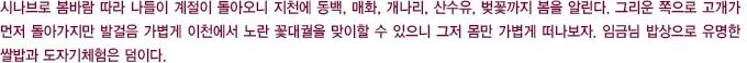 º½±â¿îÀÌ ¿Ï¿¬ÇÏ´Ï ±âºÐ ÁÁ°Ô ²É±¸°æÀ» ³ª¼±´Ù. ÀÌõ ¹é»ç¸éÀÇ »ê¼öÀ¯ ±º¶ôÁö°¡ »õ·Î¿î º½²É ±¸°æÀÇ ¸í¼Ò·Î µîÀåÇØ Àα⸦ ²ø°í ÀÖ´Ù. ÀÌõ½Ã ³»¿¡¼ ¿©ÁÖ ¹æ¸éÀÇ ÀÌÆ÷´ë±³¸¦ ÇâÇÏ´Ù Çö¹æ¸®¿¡ À̸£¸é µµ·Î ¿ÞÂÊÀ¸·Î ¿µ¿ø»ç¶ó´Â »çÂû ÀÌÁ¤Ç¥¸¦ ¸¸³¯ ¼ö ÀÖ´Ù. ÀÌõ¿¡¼ °¡Àå ³ôÀº ¿øÀû»ê(563.5m) ¾Æ·¡ ÀÚ¸®ÇÑ ¿µ¿ø»ç¸¦ ÇâÇØ °¡´Â ±æÀº ¼Û¸»¸®¿¡¼ºÎÅÍ µµ¸³¸®¸¦ °ÅÃÄ °æ»ç¸®¿¡ À̸£±â±îÁö »ê¼öÀ¯³ª¹«°¡ ´ë±Ô¸ð ±º¶ôÀ» ÀÌ·ç°í ÀÖ´Ù.