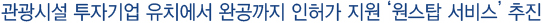°ü±¤½Ã¼³ÀÎÇã°¡Áö¿ø´Ü(T/FÆÀ)Àº °ü±¤½Ã¼³ ¹ÎÀÚÀ¯Ä¡¿¡¼ºÎÅÍ ¿Ï°ø½Ã±îÁö ÀΤýÇã°¡ÀÇ Àü°úÁ¤ ÇàÁ¤Ã¶ÀÚ Áö¿ø¾÷¹«´Â ¹°·Ð °ü±¤½Ã¼³ ¹ÎÀÚÀ¯Ä¡ ¾÷¹«¸¦ ÃѰýÇÑ´Ù. À̸¦ À§ÇØ °ü±¤½Ã¼³ ÅõÀÚ±â¾÷ÀÇ ÃÖÃÊ ÅõÀÚ»ó´ã°ú ºÎÁö¾Ë¼± µîÀ» ºñ·ÔÇØ ºÎÁö È®º¸ ÀÌÀü¿¡ °³¹ß°¡´ÉÇÑ ÅäÁö¿©ºÎ, »çÀü ½ºÅ©¸°À» ½Ç½ÃÇØ ¾ÈÁ¤ÀûÀÎ ÅõÀÚ°¡ µÇµµ·Ï öÀúÇÑ ºÐ¼®À» ÅëÇØ Áö¿øÇÒ °èȹÀÌ´Ù.