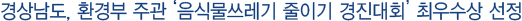 °æ»ó³²µµ´Â ȯ°æºÎ°¡ ÁÖ°üÇÑ ¡®2014³â À½½Ä¹°¾²·¹±â ÁÙÀ̱⠰æÁø´ëȸ¡¯¿¡¼ À½½Ä¹°¾²·¹±â ÁÙÀ̱⠽ÃÃ¥À» ÃßÁøÇÑ °ø·Î¸¦ ÀÎÁ¤¹Þ¾Æ ±¤¿ªÀÚÄ¡´Üü ºÎ¹®¿¡ °æ»ó³²µµ°¡ ¡®ÃÖ¿ì¼ö»ó¡¯À» ¼ö»óÇß´Ù. À̹ø ¿ì¼ö ±â°ü ¼±Á¤À¸·Î °æ»ó³²µµ´Â ȯ°æºÎÀå°ü ±â°üǥâ°ú »ó±Ý 500¸¸ ¿øÀ» ¹Þ°Ô µÇ¾ú´Ù.