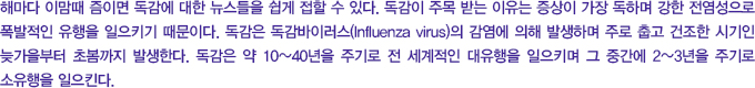 ´ëü µ¶°¨ ¹ÙÀÌ·¯½º´Â ¿Ö °É¸®´Â °ÍÀϱî? ¹Ù·Î ÀÎÇ÷翣ÀÚ ¹ÙÀÌ·¯½º(Influenza Virus)°¡ ¿øÀÎ º´¿øÃ¼ÀÌ´Ù. µ¶°¨ ¹ÙÀÌ·¯½º¿¡´Â ÀÎÇ÷翣ÀÚ ¹ÙÀÌ·¯½º A, B, CÇü ¼¼ °¡Áö°¡ Á¸ÀçÇÏÁö¸¸ »ç¶÷¿¡°Ô º´À» ÀÏÀ¸Å°´Â °ÍÀº AÇü°ú BÇüÀÌ´Ù. BÇüÀº Áõ»óÀÌ ¾àÇϰí ÇÑ °¡Áö Á¾·ù¸¸ Á¸ÀçÇÏÁö¸¸, AÇüÀº ¹ÙÀÌ·¯½º Ç¥¸é¿¡ ÀÖ´Â HÇ׿ø°ú NÇ׿øÀÇ Á¾·ù¿¡ µû¶ó ¿©·¯ °¡Áö Á¾·ù°¡ Á¸ÀçÇÑ´Ù.