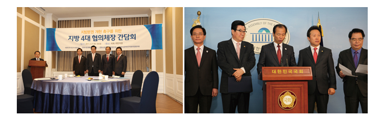 ´ëÇѹα¹½ÃµµÁö»çÇùÀÇȸ¸¦ ºñ·ÔÇÑ Áö¹æ4´ëÇùÀÇü ´ëÇ¥µéÀº 2¿ù 21ÀÏ ±¹È¸¿¡¼ °£´ãȸ¸¦ ¿°í, Áö¹æºÐ±Ç °³ÇåÀ» À§ÇØ ÇÑ ¸ñ¼Ò¸®¸¦ ³»°í °øµ¿À¸·Î ³ë·ÂÇϱâ·Î ÇÕÀÇÇß´Ù. ±×¸®°í ÀÌ·¯ÇÑ ¶æÀ» ¸ð¾Æ ±¹È¸ Á¤·Ð°ü¿¡¼ 'Áö¹æºÐ±Ç °³Çå Ã˱¸¸¦ À§ÇÑ °øµ¿¼º¸í¼'¸¦ ¹ßÇ¥Çß´Ù.