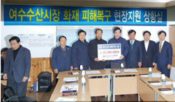 ´ëÇѹα¹½ÃµµÁö»çÇùÀÇȸ´Â 1¿ù 19ÀÏ, ¼³ ¸íÀýÀ» ¾ÕµÎ°í 1¿ù 15ÀÏ ¹ß»ýÇÑ ÈÀç·Î 70¾ï ¿ø ÀÌ»óÀÇ Àç»êÇÇÇØ°¡ ¹ß»ýÇÑ ¿©¼ö¼ö»ê½ÃÀå ÇöÀåÀ» ¹æ¹®ÇÏ°í »óÀÎ ¹× °ü°èÀÚµéÀ» À§·ÎÇß´Ù. À̳¯ ÇöÀå¿¡´Â ´ëÇѹα¹½ÃµµÁö»çÇùÀÇȸ¸¦ ´ëÇ¥ÇÏ¿© ȸÀåÀÎ ÃÖ¹®¼ø °¿øµµÁö»ç¿Í À̳«¿¬ Àü¶ó³²µµÁö»ç¸¦ ºñ·Ô, ÀÎÁ¢ ½ÃµµÀÎ ±¤ÁÖ±¤¿ª½Ã¤ýÀü¶óºÏµµ¤ý°æ»ó³²µµ ºÎ½ÃÀå¤ýºÎÁö»ç°¡ Âü¼®ÇÑ °¡¿îµ¥ 2,000¸¸ ¿øÀÇ ÇÇÇØº¹±¸ ¼º±ÝÀ» Àü¶ó³²µµ¿¡ Àü´ÞÇß´Ù. ´ëÇѹα¹½ÃµµÁö»çÇùÀÇȸÀåÀÎ ÃÖ¹®¼ø °¿øµµÁö»ç´Â "¼³ ¸íÀýÀ» ¾ÕµÎ°í ¹ß»ýÇÑ ÈÀç·Î ½ÇÀÇ¿¡ ºüÁ® ÀÖÀ» »óÀε鿡°Ô ±íÀº À§·ÎÀÇ ¸»¾¸À» µå¸°´Ù"¸ç, "ÀûÀº ¼º±ÝÀÌÁö¸¸ ÇÇÇØ »óÀε鿡°Ô Á¶±ÝÀ̳ª¸¶ ÈûÀÌ µÇ±â¸¦ ¹Ù¶õ´Ù"°í ¸»Çß´Ù.