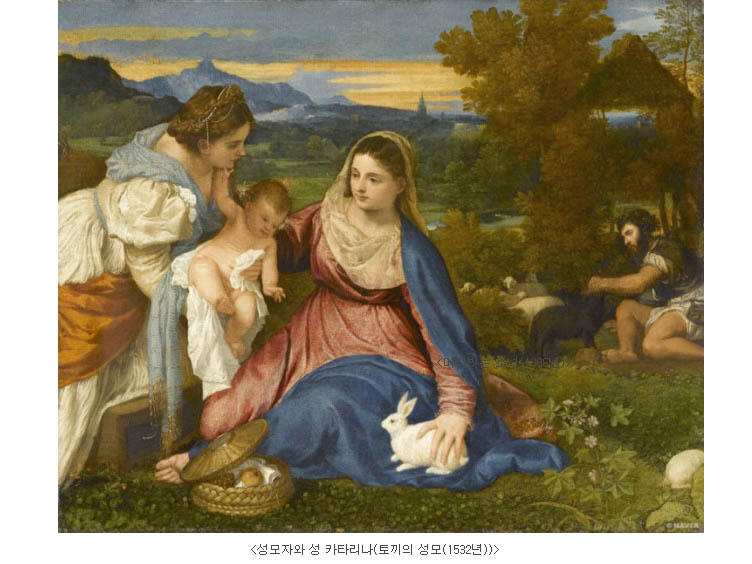 <¼º¸ðÀÚ¿Í ¼º īŸ¸®³ª(Åä³¢ÀÇ ¼º¸ð)>´Â ¸¸Åä¹Ù °øÀÛ Æäµ¥¸®ÄÚ °ïÀÚ°¡(Federico ¥± Gonzaga)ÀÇ ¼ÒÀåǰ °¡¿îµ¥ ÀÖ¾ú´ø °ÍÀ¸·Î ÃßÁ¤µÇ´Â ÀÛǰÀÌ´Ù. ¼ø±³ÇÑ ¼ºÀΠīŸ¸®³ª°¡ ±×³àÀÇ »ó¡¹°ÀÎ ¸ø ¹ÚÈù ¼ö·¹¹ÙÄû¿¡ ¹«¸À» ¾ñ°í ¼º¸ðÀÚ¿Í ÇÔ²² ÃÊ¿ø¿¡ ³ª¿Í ÀÖ´Ù. ¼º¸ðÀÇ ¿Þ¼Õ ¾Æ·¡ Åä³¢´Â ¼ø¼öÇÏ°í °â¼ÕÇÑ ¸¶¸®¾ÆÀÇ »ó¡À¸·Î µîÀåÇß´Ù. È¸é ¿À¸¥ÂÊ¿¡ º¸ÀÌ´Â ¸ñµ¿Àº ±×³É ¸ñµ¿ÀÏ ¼öµµ ÀÖ°í ¿ä¼ÁÀ̳ª ¼¼·Ê ¿äÇÑÀÏ ¼öµµ Àִµ¥, ±×ÀÇ ¿ë¸ð´Â ÈÄ¿øÀÚÀÎ Æäµ¥¸®ÄÚ °ïÀÚ°¡ÀÇ ÃÊ»ó°ú ¾ÆÁÖ À¯»çÇÏ´Ù. ¼º¸ðÀÇ ¸ð½ÀÀº 1530³â¿¡ »ç¸ÁÇÑ È°¡ÀÇ ¾Æ³» üĥ¸®¾Æ(Cecilia)¸¦ ¸ðµ¨·Î ÇßÀ» °ÍÀ¸·Î ÃßÁ¤µÈ´Ù.