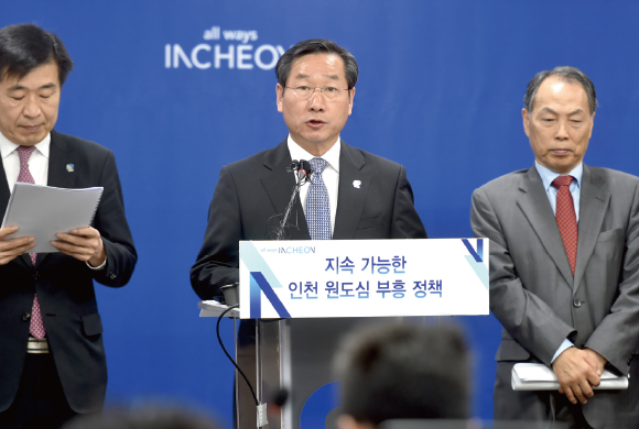 희망 나누는 ÷ 원도심 부흥 인천시는 진정한 공존과 상생의 도시로 거듭나기 위해 흙 한 줌에도 지역의 역사와 전통이 스며있는 원도심 살리기에 집중한다. 원도심 재생은 부수고 새로 짓는 구식 재개발이 아닌, 지역의 고유 문화를 지키면서 4차 산업혁명과 선진 인프라가 융합된 인천형 도시재생방식을 추구한다. 단기와 중·장기 정책의 조화 속에서 주차장과 공원 등 공공시설을 빠르게 확충해 사람이 모이고 과거와 미래가 만나는 기술과 낭만이 어우러진 공간으로 재탄생시킬 예정이다. 원도심의 가치를 찾는 것은 대한민국의 과거, 현재, 미래를 연결하는 소중한 자원이며, 원도심의 부활은 인천시 전체가 발전하는 동력이 될 것이라는 생각으로, 근대문화 자산과 해양, 관광이 결합된 새로운 창조모델의 인천개항창조도시 재생사업, 인천 내항 재개발, 왕의 길을 중심으로 강화문화 가꾸기 등의 사업을 추진해 2018년 원도심에 인천의 새로운 역사를 그릴 계획이다.