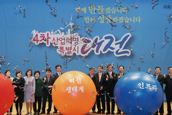 정계, 민·관과 적극적인 협력 다져 국회 4차 산업혁명 포럼과 MOU 체결(2017. 11. 8)로 정계와 협력관계를 공고히 했으며, 세계경제포럼 클라우스 슈밥 의장의 대전시 방문 약속과 함께 응원 메시지를 보내주는 등 세계무대에 대전의 이름을 알리며, 4차 산업혁명 특별시에 한 발 더 다가가는 계기를 마련했다. 또한, 사업이 지속성을 갖고 속도감 있게 추진되기 위해서는 민과관이 협업해 추진하는 것이 무엇보다 중요하다고 판단해 시는 지난 7월 전국 최초로 ‘4차 산업혁명 추진위원회’를 출범했고, 정책방향을 설정하고 사업을 가다듬기 위한 전문가 그룹으로 ‘기획평가정책위원회’를 구성·활동 중이며, 산학연 관계자 10여 명 내외로 구성된 총 200여 명이 활동하는 24개의 과제별 추진단을 구성해 사업 기획부터 실행, 완료까지 모든 과정을 총괄 운영하고 있다. 대전시는 코디네이터로서 지원과 협력을 하며 과제 구체화 및 실행을 위해 노력하고 있다. 4차 산업혁명에 대한 기대와 우려의 목소리가 공존하고 있는 가운데, 우리의 삶은 좀 더 ‘편리’해지고 ‘안전’한 생활을 영위하며 개인별 ‘맞춤’ 서비스는 증진될 것이다. 예를 들면, AI 교통정보 분석을 통해 교통 신호대기 시간이 40% 이상 감소되고, 빅데이터 등을 활용해 범죄 발생율은 낮아질 것이며, 중이온 가속기를 활용한 새로운 암 치료 의료 서비스 제공 등으로 시민들의 삶의 질은 빠른 속도로 향상되리라는 것이 전문가들의 보편적인 견해다. 또한, 4차 산업혁명 선도를 통해 대전의 GRDP는 현재 34조 원에서 2030년 134조 원으로 대폭 증가할 것으로 예상하며, 신규 일자리는 4만 8,000여 개가 생길 것으로 전망되고 있다. 2017년도는 추진 과제 발굴, 추진체계 구축, 대시민 공감대 형성 등 4차 산업혁명 특별시 조성을 위한 발판 마련에 주력해왔으며, 이를 기반으로 2018년도에는 국비 확보 및 사업 구체화 등 시민들이 체감할 수 있도록 사업 가시화를 위해 총력을 다할 것이다.