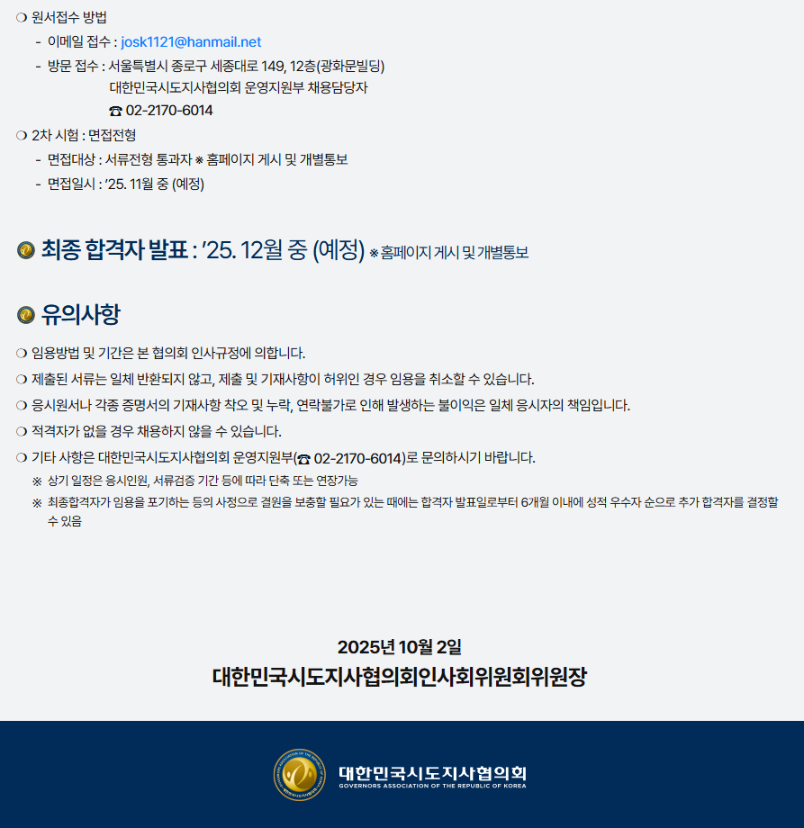 대한민국시도지사협의회 하반기 공개모집 공고