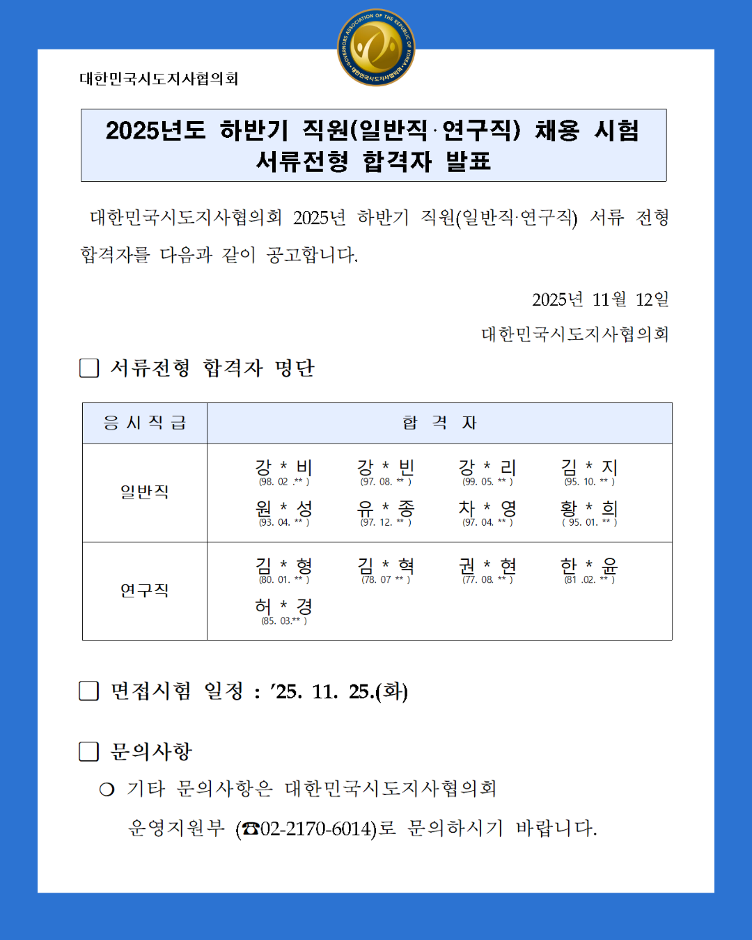 2025년도 하반기 직원(일반직‧연구직) 채용 시험 서류전형 합격자 발표
