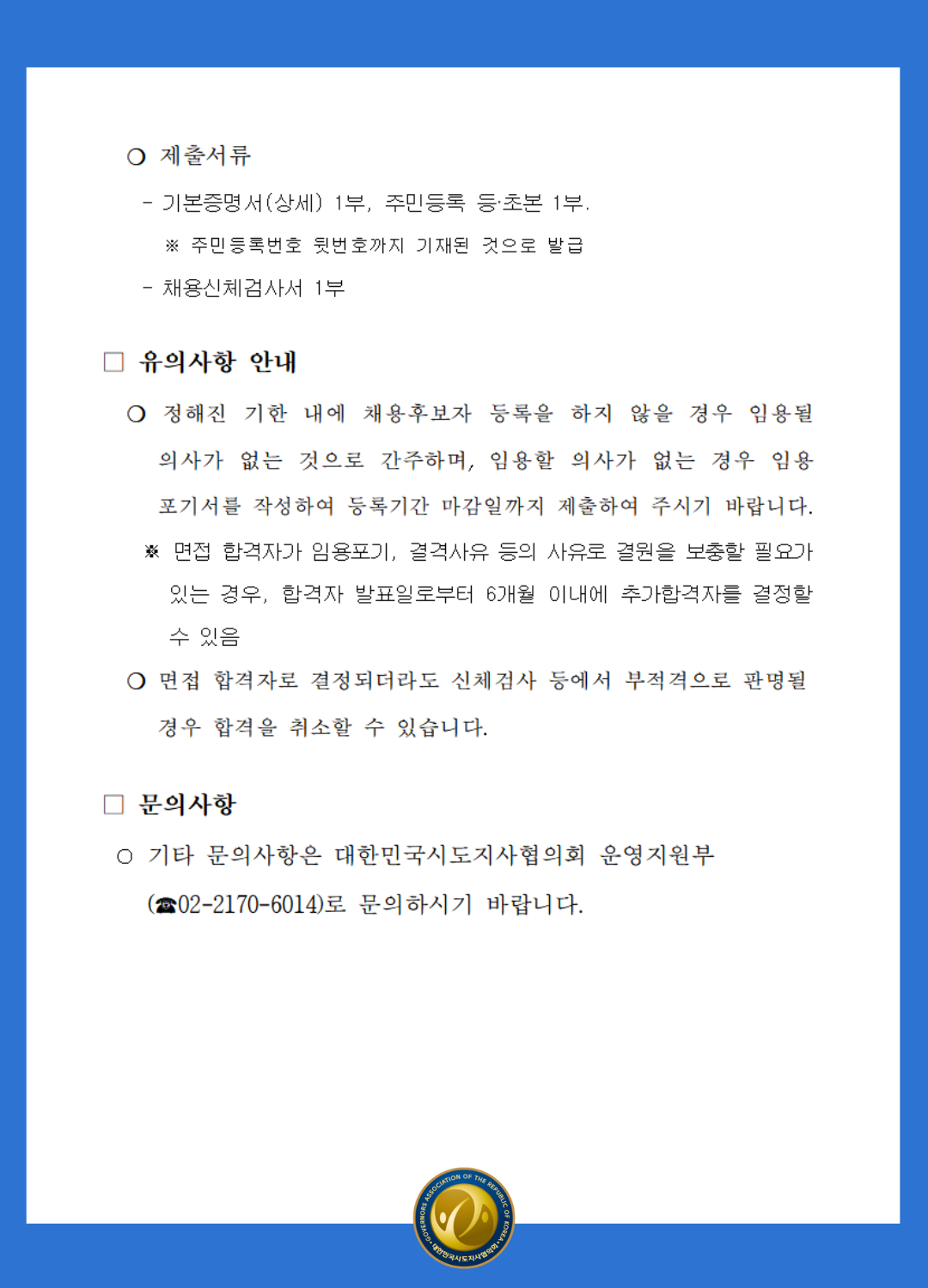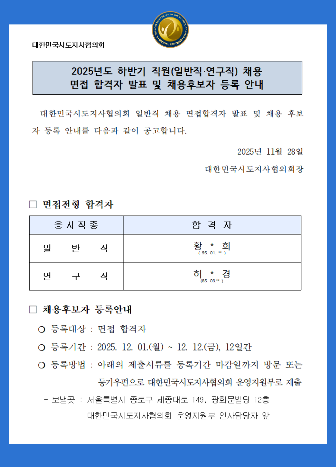 2025년도 하반기 직원(일반직‧연구직) 채용 면접 합격자 발표 및 채용후보자 등록 안내