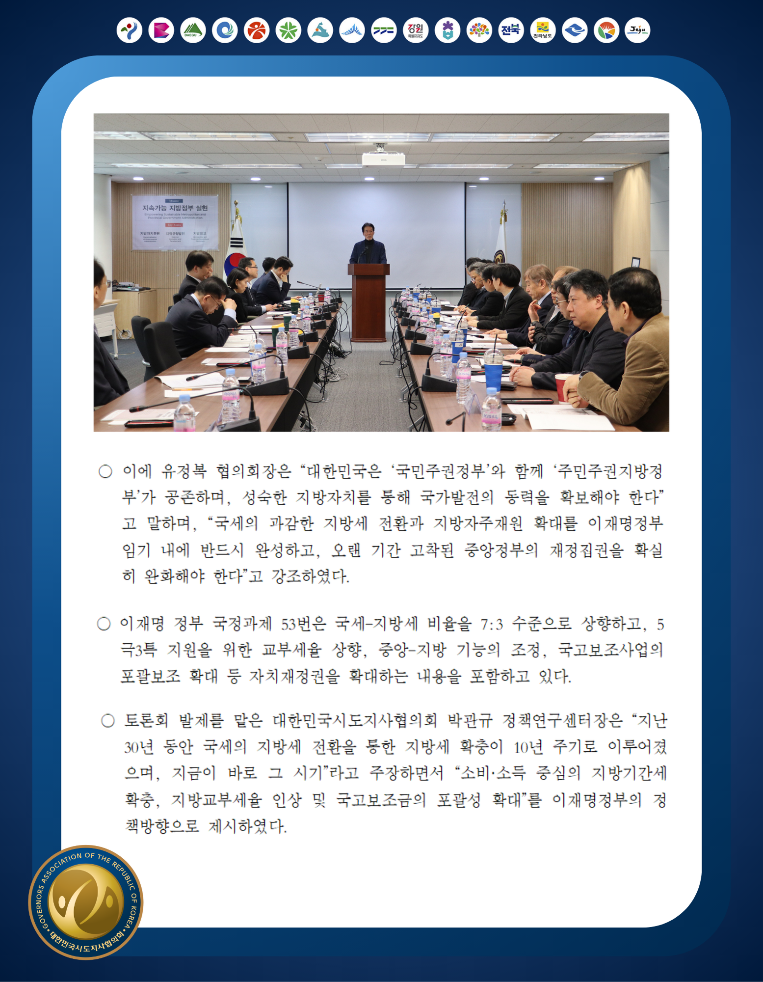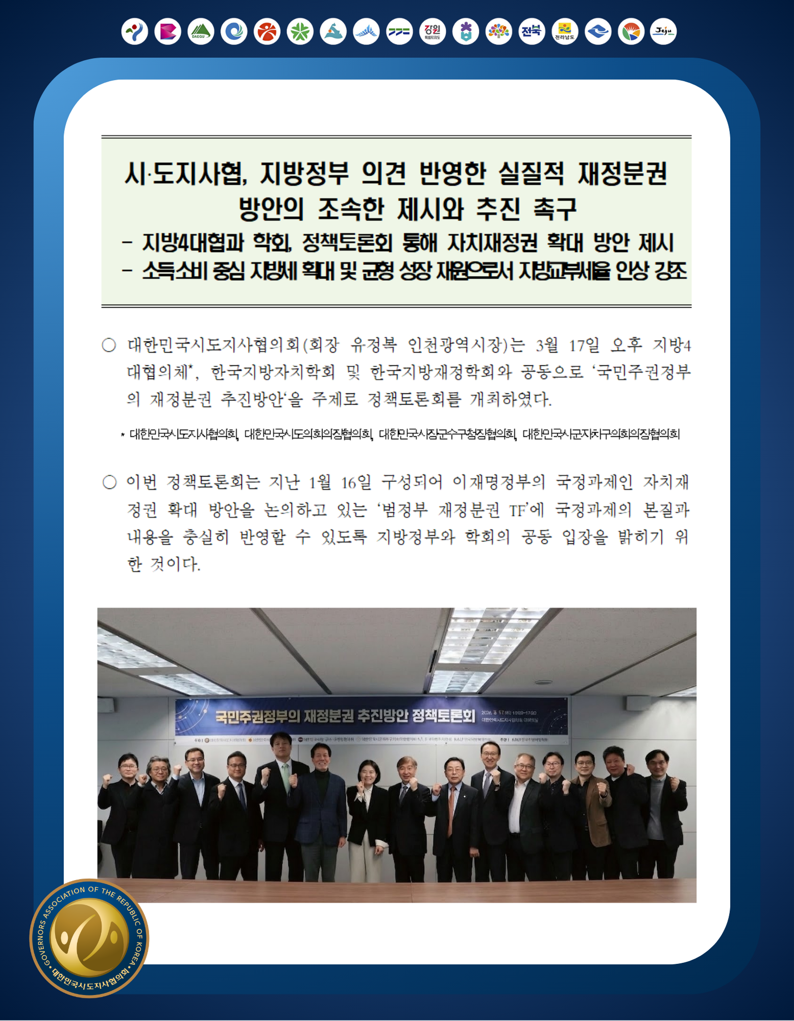 시·도지사협, 지방정부 의견 반영한 실질적 재정분권 방안의 조속한 제시와 추진 촉구