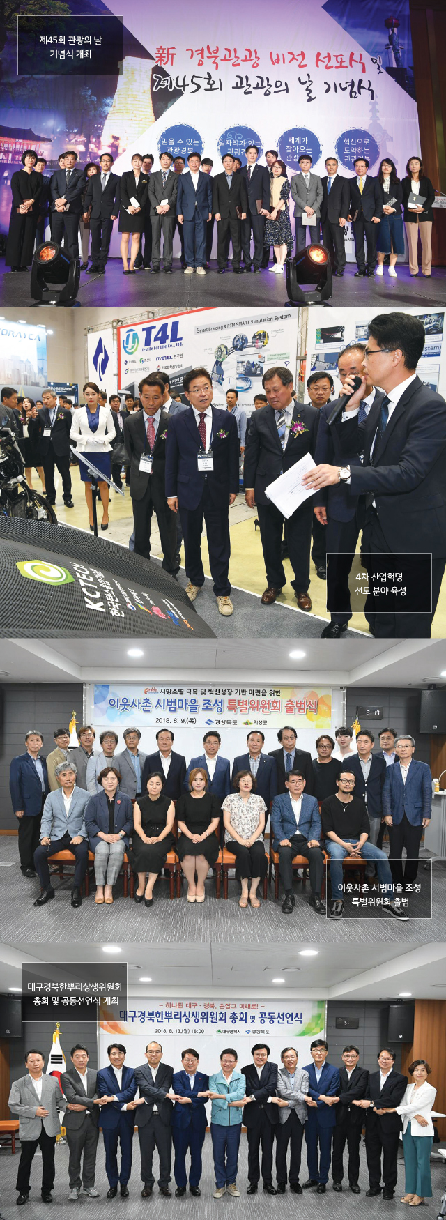 상생협력으로 지역 백년대계를 잇다 대구와 경북은 대한민국을 이끌어온 한 뿌리이다. 구미 전자, 포항 철강, 대구 섬유로 산업화・근대화를 주도하여 국난과 위기를 호국정신으로 함께 이겨낸 한 가족이라 할 수 있다. 이에 경북도는 SOC 및 산업 협력을 강화하기 위해 광역권 전철망 및 대구도시철도 연장 사업을 공동 추진한다. 또한, 대구 인접 지역(칠곡・고령・경산)의 도시 계획 공동 입안, 빅테이터 공동 구축, 4차 산업혁명 인재 공동 양성에 함께 손을 잡는다. 경북도는 경북과 대구의 문화・정신・생활이 하나로 상생할 수 있도록, 경북과 대구가 하나의 나라처럼 운영되도록 할 계획이다.