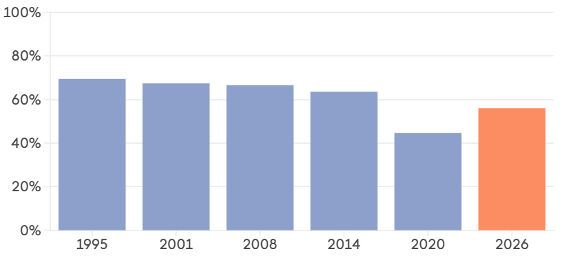 • 전국 평균 투표율 잠정치: 56% ~ 58.5% 추정