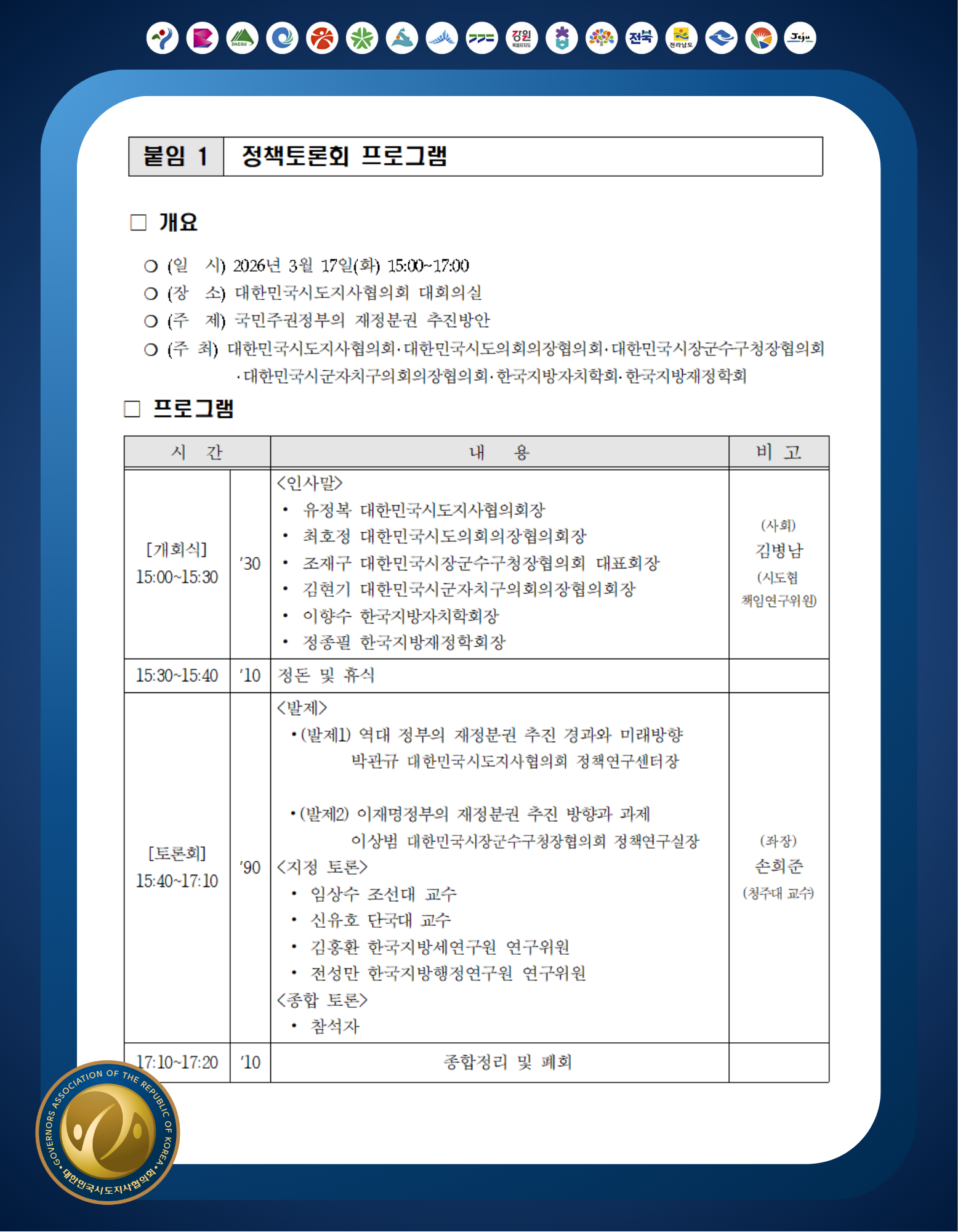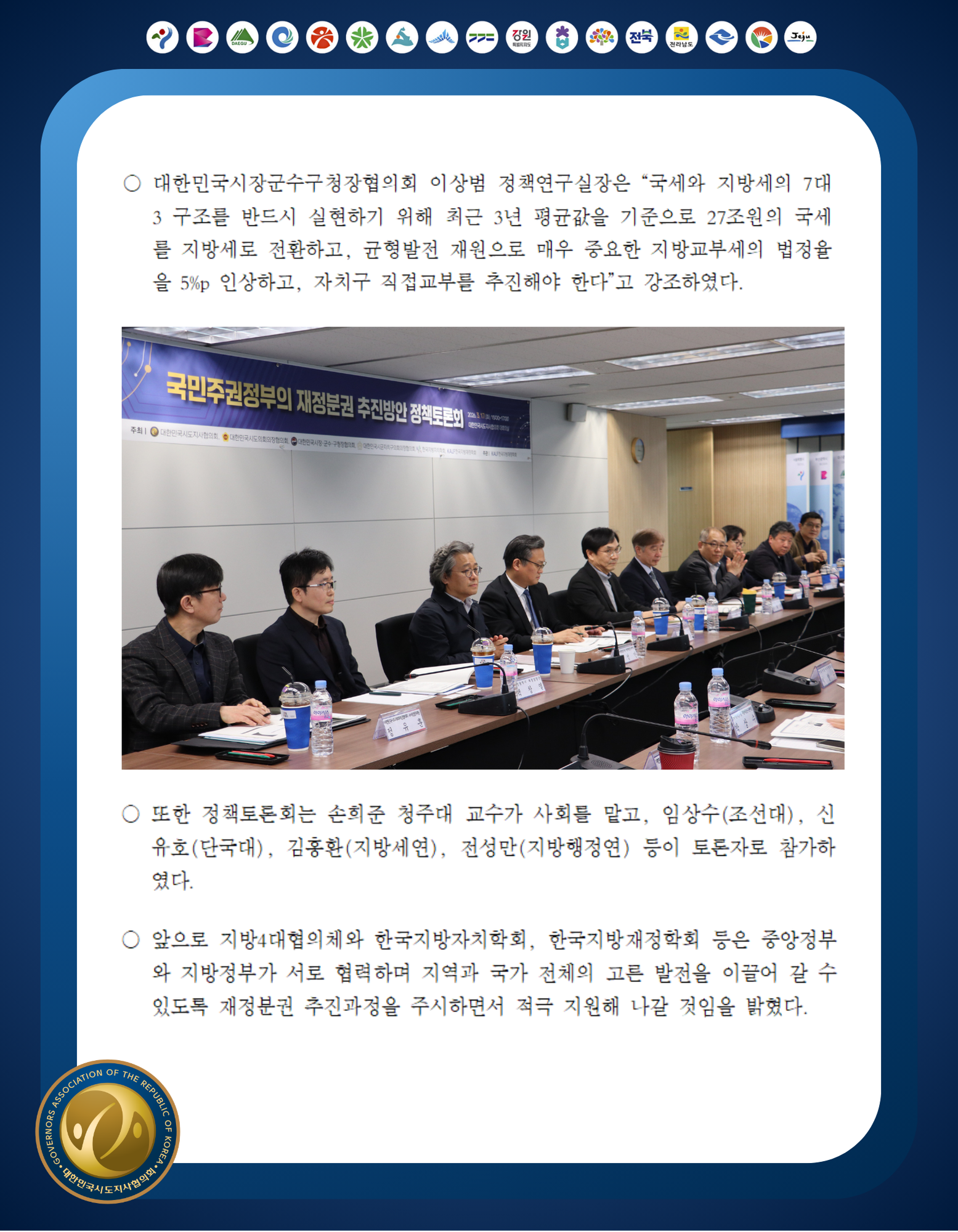 시·도지사협, 지방정부 의견 반영한 실질적 재정분권 방안의 조속한 제시와 추진 촉구