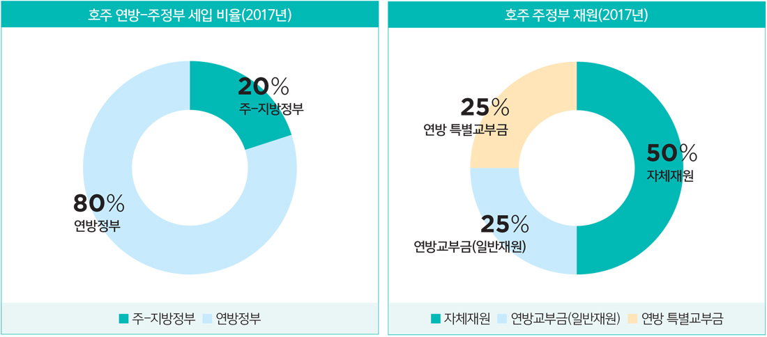 2017년 기준, 호주의 연방-주・지방 정부 간의 세입비율은 8:2 정도로 큰 격차를 보이고 있다. 이에 따라 연방정부는 주・지방 정부의 운영을 위해 필요한 재원을 연방교부금의 형태로 각 주에 배분하고 있다. 연방교부금은 각 지방의 최소한의 기본행정 서비스를 제공하기 위해 필요한 재원을 연방교부금 산정의 주요 원칙인 ‘수평적 재정형평성’에 따라서 일반교부금 형태로 각 주정부에 교부한다. 연방교부금 산정의 주요원칙인 수평적 재정형평성은 다음과 같이 설명된다. “주정부들은 그들이 자체재원으로부터 세수를 신장시키기 위해 동일한 노력을 할 경우 그들의 주민들에게 유사한 행정서비스 기준과 인프라를 제공할 수 있는 재무능력을 갖춰야 한다.”